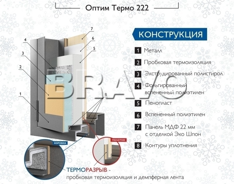 Терморазрыв (термомост) из натуральной пробки по периметру полотна. Внутри полотна установлена конструкционная теплоизоляционная панель SIP (Structural Insulated Panel), которая не только обеспечивает необходимую тепло- и шумоизоляцию, но и придает дополнительную жесткость и прочность дверному блоку.