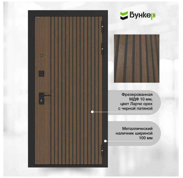 | Внешняя отделка | МДФ панель 10 мм с фрезеровкой, цвет Ларче орех с черной патиной |