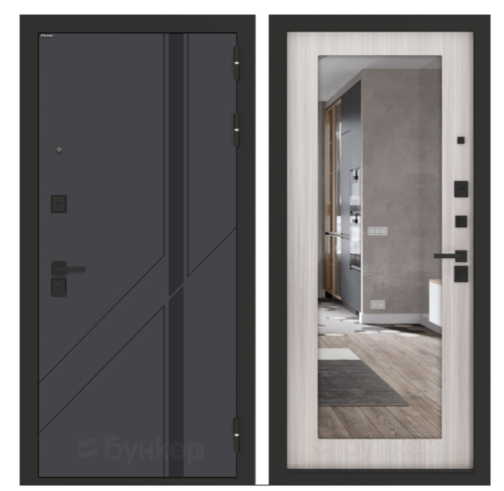 | Фурнитура | Металлическая черная: Броненакладкая, сувальдные накладки со шторкой, ручка FZ21-241 D BL, ночник, цилиндр ключ-вертушка, глазок сбоку или по центру |