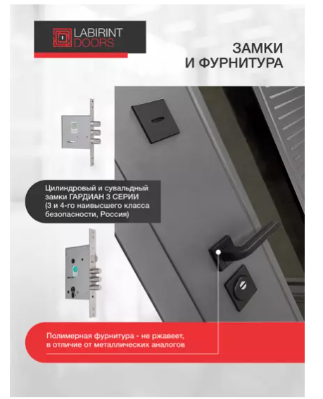 Полимерная фурнитура: сувальдные накладки со шторками, ручка, ночная задвижка, эксцентрик (с защитой от истирания) |