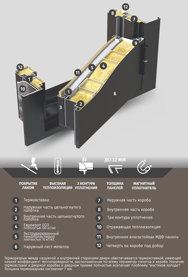 Терморазрыв между наружной и внутренней сторонами двери обеспечивается термовставкой имеющей низкий коэффициент теплопроводности, расположенным по всему периметру полотна и короба. Наличие термовставки в дверной коробке и дверном проеме полностью исключает проблему "мостиков холода"! Толщина терморазрыва - 7 мм.