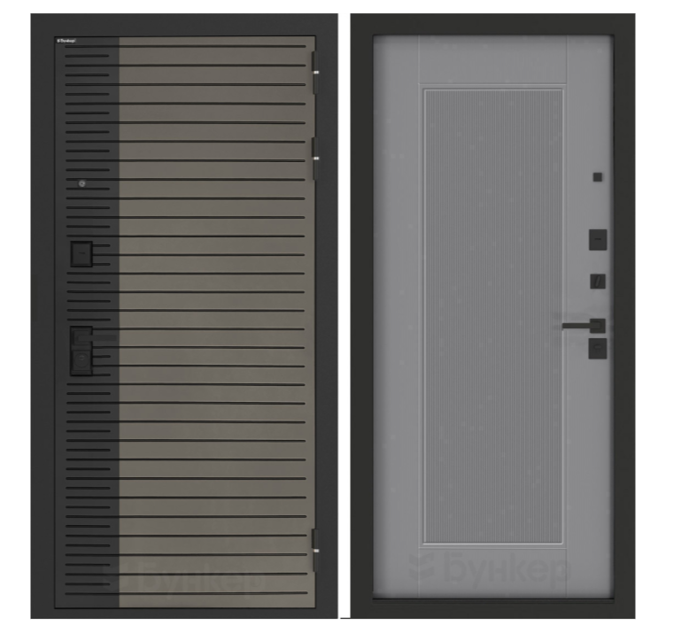 Фурнитура Металлическая черная: Броненакладкая, сувальдные накладки со шторкой, ручка FZ21-241 D BL, ночник, цилиндр ключ-вертушка, глазок сбоку или по центру