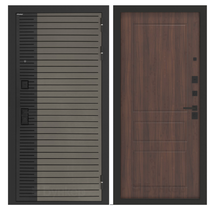Фурнитура Металлическая черная: Броненакладкая, сувальдные накладки со шторкой, ручка FZ21-241 D BL, ночник, цилиндр ключ-вертушка, глазок сбоку или по центру